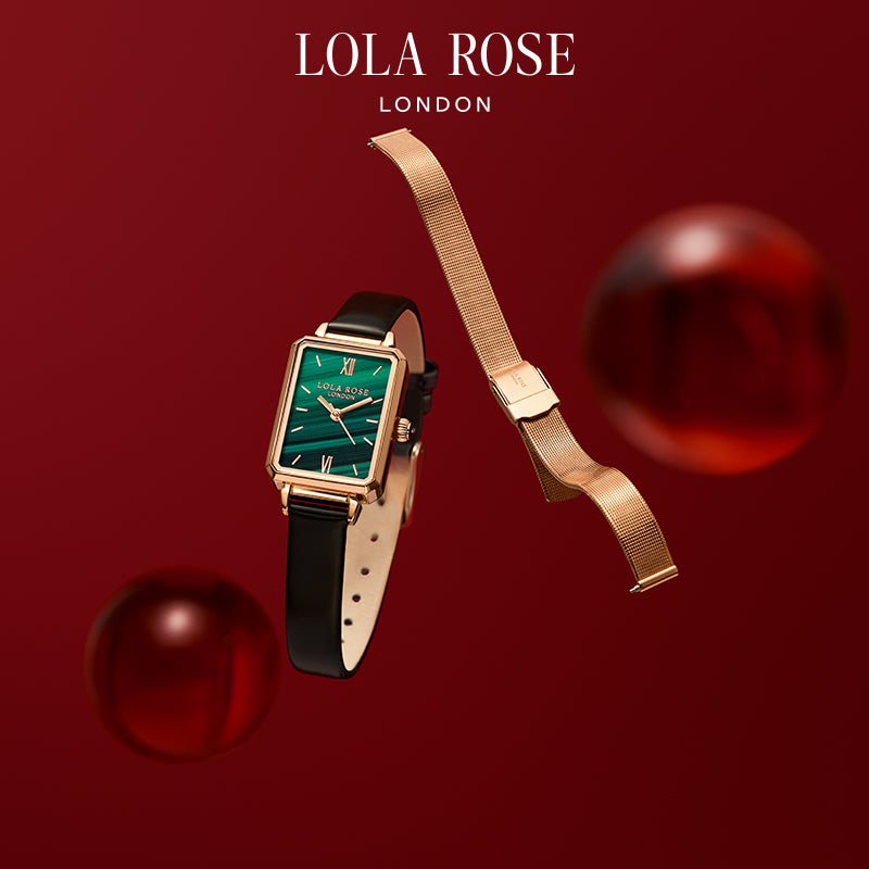 Indulge in the allure of the renowned Ms Lola collection from Lola Rose, where this exquisite timepiece takes centre stage. Featuring the iconic octagonal square watch case and a mesmerising malachite texture dial, it is perfectly complemented by a luxuriously comfortable black leather strap. Adorned with Lola Rose's signature geometric elements, this piece exudes a captivating blend of retro charm and contemporary fashion. Elevate your style even further with the included Milanese steel strap, adding an extra layer of elegance and versatility to this timeless masterpiece.