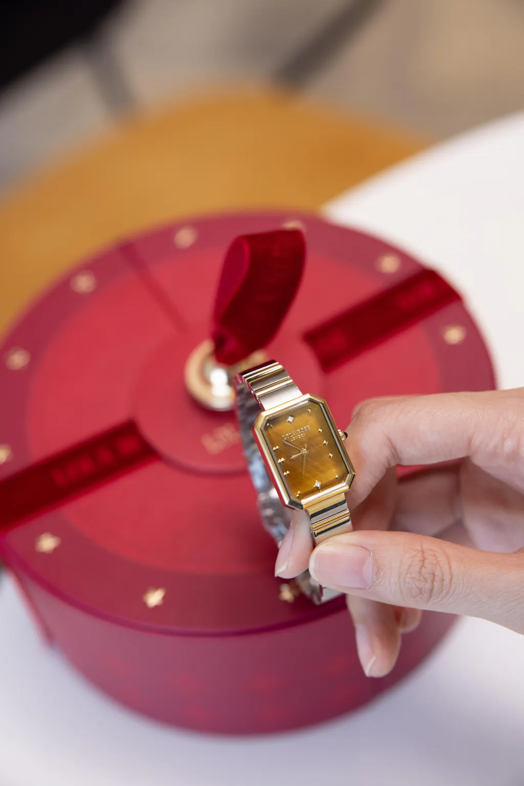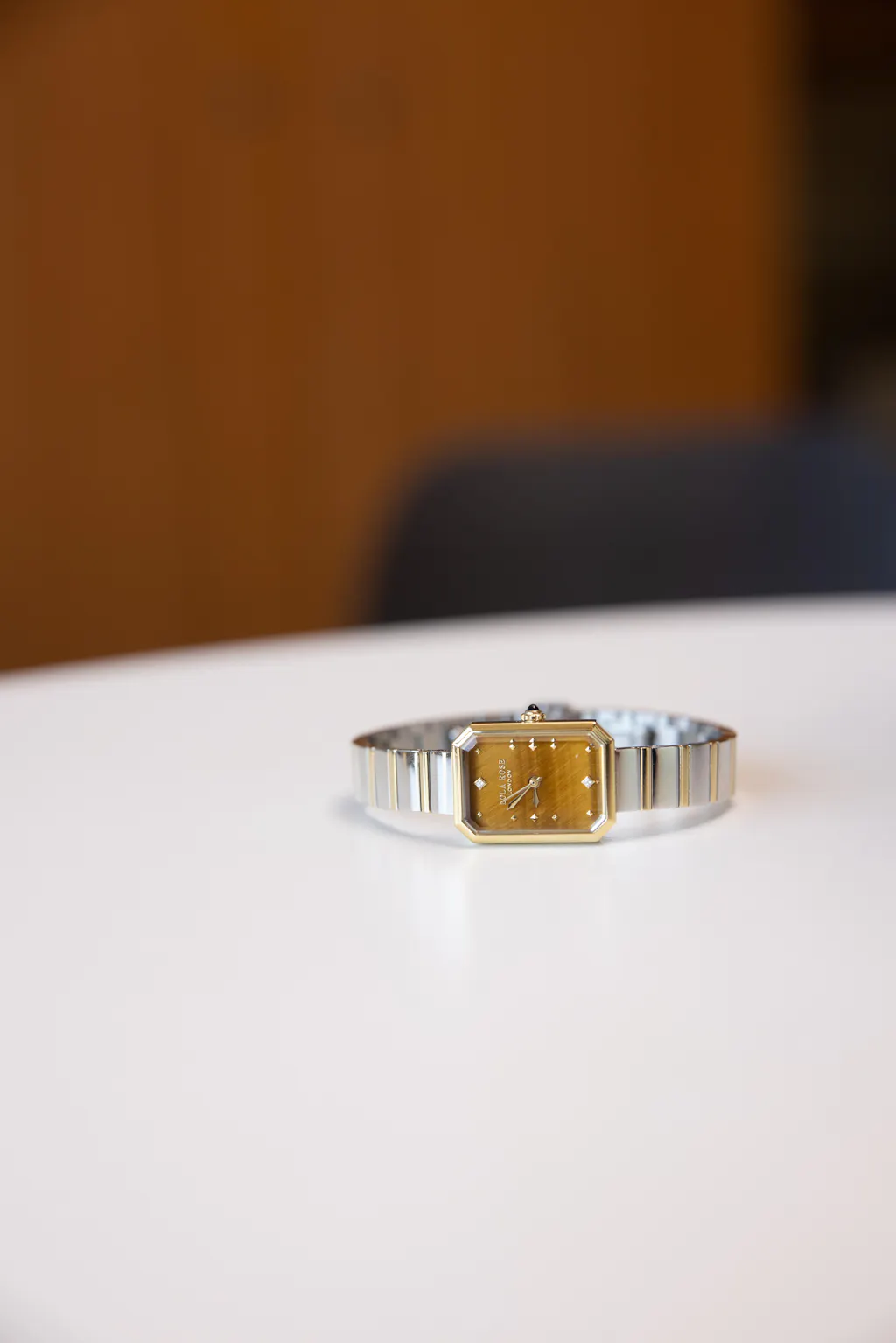 Inspired by the timeless allure of an "octagonal jewellery box," the dial design is a study in sleek elegance, exuding a singular individuality that captures the essence of its wearer. The gold bracelet, with its chic and minimalist aesthetic, wraps the wrist like a whispered promise, perfectly complementing the natural gemstone. This exquisite fusion of vintage charm and contemporary flair invites you to embrace a world where time is not just measured but experienced, a world where every glance at your wrist evokes a sense of wonder and possibility.