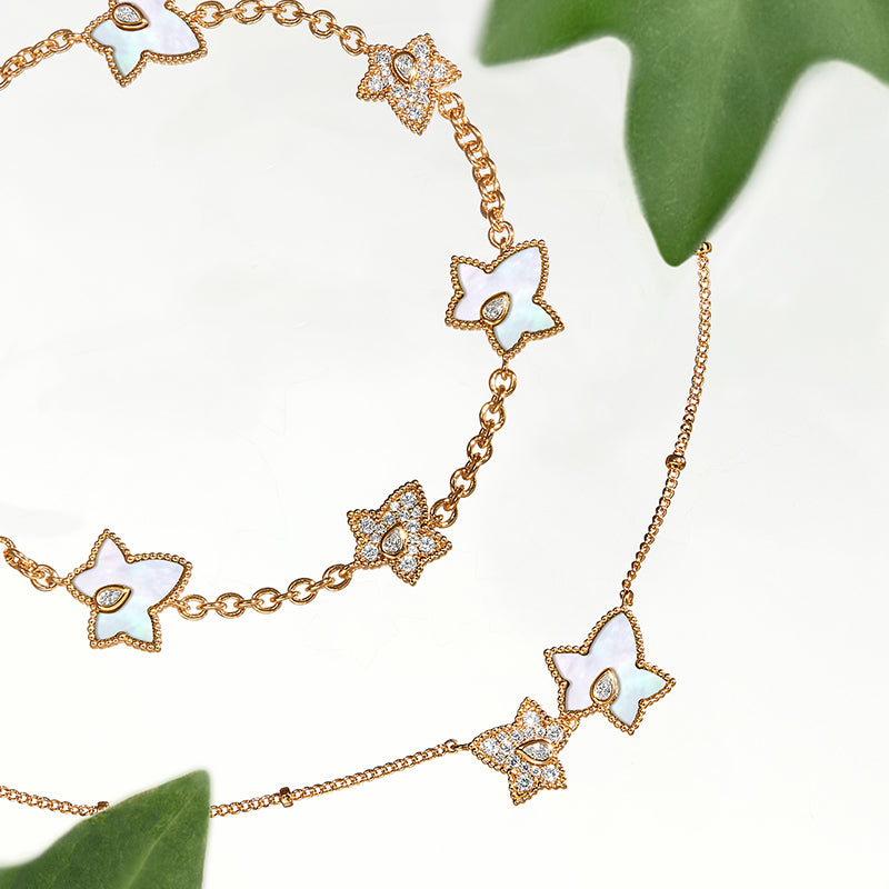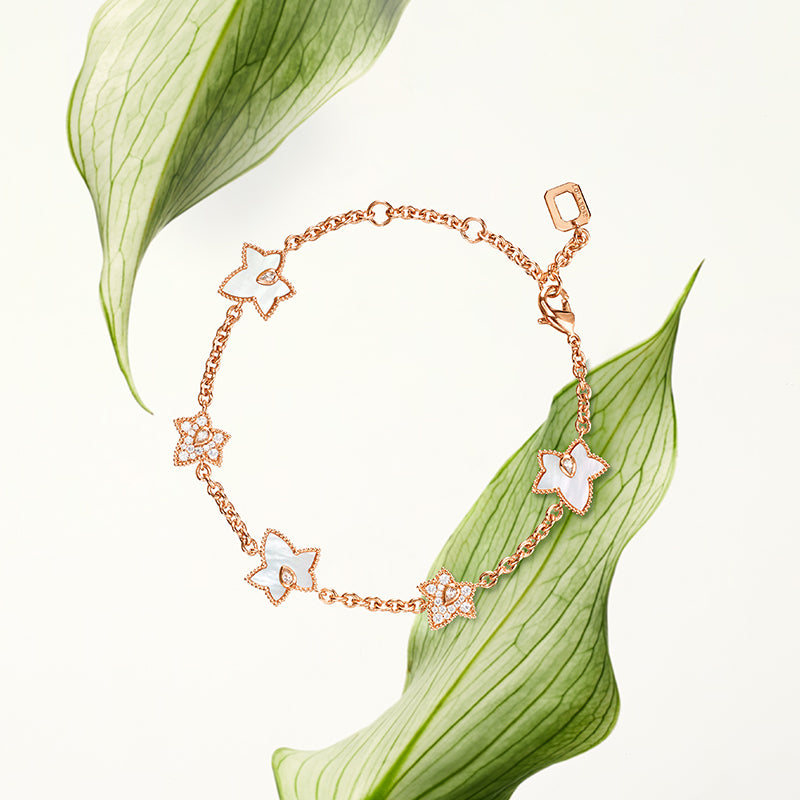 In the heart of an English manor, ivy thrives year-round, climbing gracefully and symbolizing nature’s resilience and vitality. The designer draws inspiration from this, blending gemstones with organic forms to reflect the inner strength and elegance of every woman.