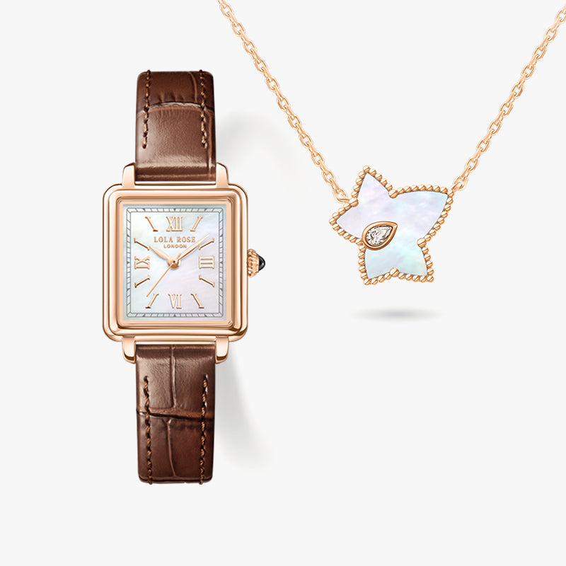 Cube Mother of Pearl Watch & Bead Necklace Gift Set