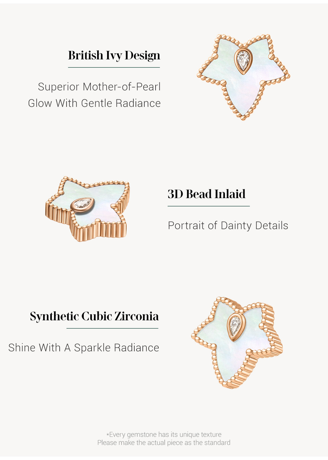 Crafted with the soft white hues of mother of pearl and adorned with a pyriform zircon, this piece weaves a narrative of romance and vintage manor culture. Each element of the Ivy Collection whispers tales of hidden libraries, candlelit studies, and the eternal charm of ivy-clad stone walls, making it a perfect embodiment of sophistication and enduring beauty.